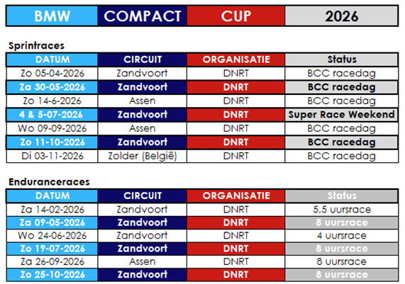 Hier vindt je de BMW Compact Cup racekalender voor